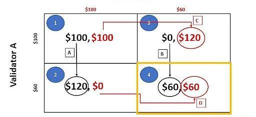 請注意,在上述兩種情況下,將利潤設置為60美元而不是100美元是驗證者A的主導策略。驗證者A將利潤設置為100美元從來都不是最佳響應。