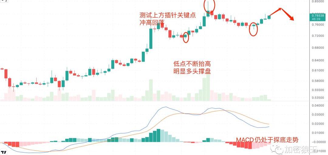 昨天老狼聊過GMT表現非常強勢,低點不斷抬高,多頭加大撐盤力度,GMT仍處于上沖走勢,上方0.8美元是插針關鍵點,多頭量能持續減弱,說明需要進一步筑底,接下來GMT在0.8美元做小雙頭回落。