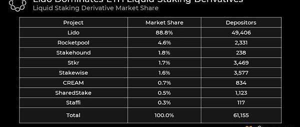 對于液態質押來說,Lido在市場上占主導地位。液態質押衍生品幫助用戶將其質押資產變現,從而提高資本效率。