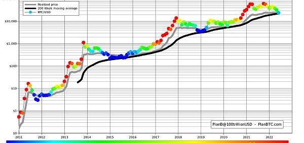 PlanB稱:“有些人正在等待深藍色。但這次我們可能不會有深藍色。深藍色=低于每月ATH的70%=0.3*61K=18K。問題:18K低于200WMA(22K),這在以前從未發生過。或者我們有深藍色并且突破200WMA,或者200WMA持有并且沒有深藍色!”