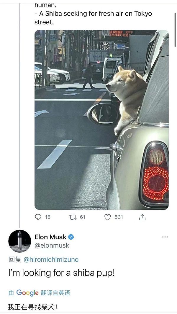 馬斯克隨即回應:“我正在尋找一只柴犬。”