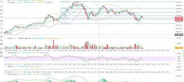短周期小時圖上看,布林帶呈向上開口,行情承壓于38000一線走出反轉。目前價格有三連陰的趨勢,短期走勢進入回調節奏,后續若是32800位置跌破,價格還會進一步向下試探,望各位提前做好準備。附圖RSI和Stoch走勢均維持下行,由此可見短期走勢還是以回調為主。下方支撐關注32000一線,上方壓制關注33800位置附近。