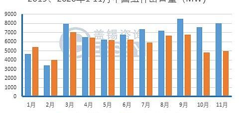 從2019、2020年1-11月中國組件出口量來看,2020年1月、2月由于疫情原因,中國組件出口量小于2019年。隨著中國疫情逐漸可控,3-11月組件出口量均高于2019年。尤其在2020年高峰時期,7-11月份同比增長逐漸增大。