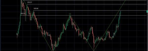 按照形態學理論,W底部形成后,上漲幅度應該至少滿足從W底部到頸線的漲幅,145-22+145=268,也就意味著LTC至少會漲至268上方。如果以1.382倍來推算LTC講漲至370美元上方(266X1.382=370.37)