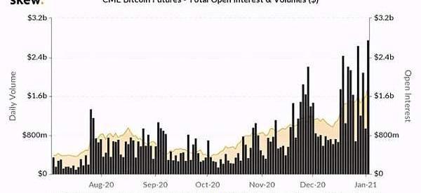 如所附圖表所示,CME期貨交易量創下了過去24小時的歷史新高,金額接近27億美元。在撰寫本文時,日均交易量遠高于7億美元。