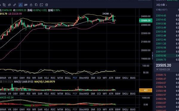 昨日比特幣走勢基本處于震蕩上行趨勢,今日凌晨再創新高24288附近后走出大型反轉,急劇下滑千余點,在觸及23130附近后出現反彈,目前在23500附近調整,比特幣短時間出現大幅度漲跌,建議大家做好風控。