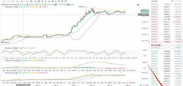 ????今日大餅在沖高23227高位,受到上方壓制,也就形成了今日的高點,說明多頭無力,今日的波動還是有的,就是沒有前兩天的大,也可能是放假的原因,四小時圖來看,今日的幣價區間在500美金左右,在早間K線收十字陰后,幣價開始下跌,技術上來看,空頭能量呈放量形態,但是沒有那么明顯,快線死叉慢線向下的趨勢也不明顯,RSI快線在50位置拐頭向上,晚間的操作思路還是高空為主