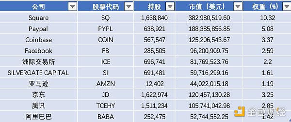 截至2021年7月20日,ARKF持有45支股票,其中Square、PayPal、Coinbase等10支股票明顯與加密貨幣、區塊鏈相關。