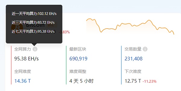 BTC全網算力95.889EH/s,挖礦難度16.55T,目前區塊高度622841,理論收益0.00001519/T/天。