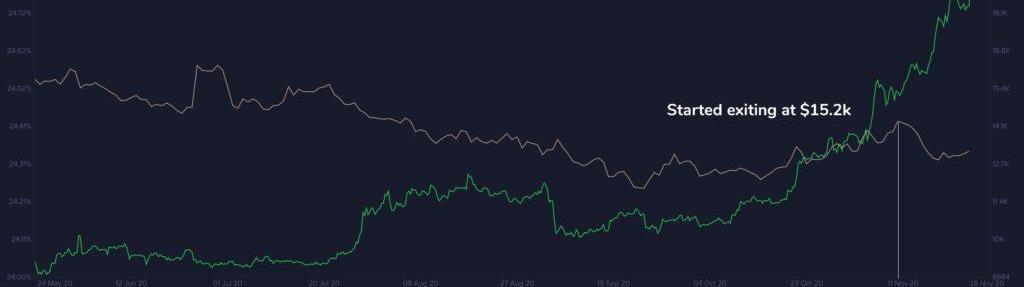 持有1BTC以下的錢包地址中的BTC數量從13500刀開始出現明顯下降,可以解讀為小散戶們選擇了賣出套現。