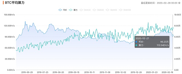 受疫情影響,當前全網算力113.54EH/s ,挖礦難度為15.49T,已經停滯了一個月,目前處于1月28日的水平。