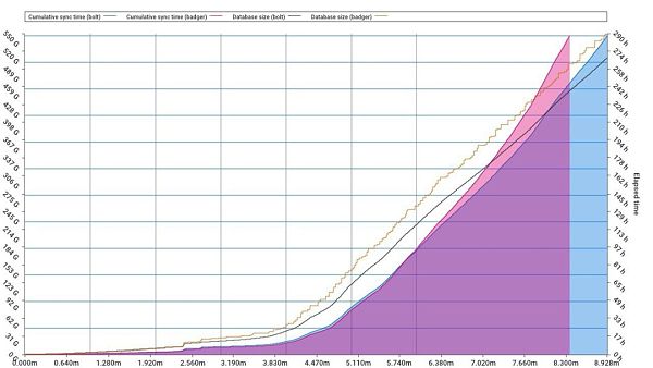 這里有一個圖表,顯示了 BadgerDB 和 BoltDB 在整體性能上的對比(感謝 Alexey Akhunov 制圖):