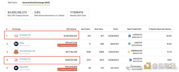 第二,如果你仔細觀察成交量,CoinBase前幾個月日交易額低迷到20億左右,同時間UNI日交易額大概是10-15億左右,現在CoinBase大概能恢復到日40億,但是UNI的日交易額仍然是10-15億,交易如此,借貸三巨頭的也同樣面臨從成長股到白馬價值股的轉變,核心問題都在于環比的增長速度。我們知道 股價=E*PE,公式很簡單,就是決定股價的就兩個變量,一個是盈利,一個是估值,同理,當UNI的交易額不變說明盈利不變,那股價要上漲只能靠估值的提高,如果你還有印象幣圈交易所FTX/幣安等大概的長期PE都在5-10,要提升估值提升對未來的持續性成長預期,一時半會還是比較難的,所以UNI的價格基本就是Beta式上漲。UNI雄踞Dex60%的市場份額,UNI如此其他DeFi也大概能探知究竟了。