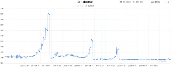 上圖為歷史上以太坊出塊時間的變化,可以看到正常情況下出塊時間維持在13-14秒,但出現過三次急劇上升的情況,這三次正是難度炸彈開啟的時候。每次開啟后,出塊時間都會呈現鋸齒狀上升,這便是因為每挖出10萬個區塊難度會調整一次。以最初的13秒為例,10萬個區塊大約耗時15天,而最后一次時間增加到25秒,此時10萬個區塊需耗時將近一個月,因此鋸齒呈現逐漸變寬的趨勢。三次難度炸彈最終都被暫停并推遲,原因就是以太坊開發團隊還沒做好完全轉向 PoS 的準備,而 PoW 模式下區塊難度的上升會導致交易等待時間和叔塊概率的增加,從而降低以太坊的實用性與安全性。