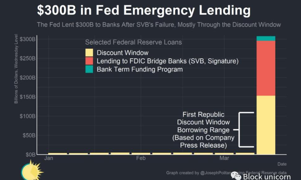 然而,美聯儲的大部分貸款(2950億美元)來自貼現窗口,這是美聯儲歷史上為向銀行提供緊急流動性而保留的抵押直接貸款工具。美聯儲為SVB和SignatureBank向FDIC旗下的過橋銀行提供了1420億美元貸款,并通過貼現窗口向私人銀行提供了1520億美元貸款。在這1500億美元的私人借款中,有一家私人銀行可能占了大部分——第一共和國銀行,他們發表聲明說,自硅谷銀行倒閉以來,他們的貼現窗口借款從200億美元到1090億美元不等。