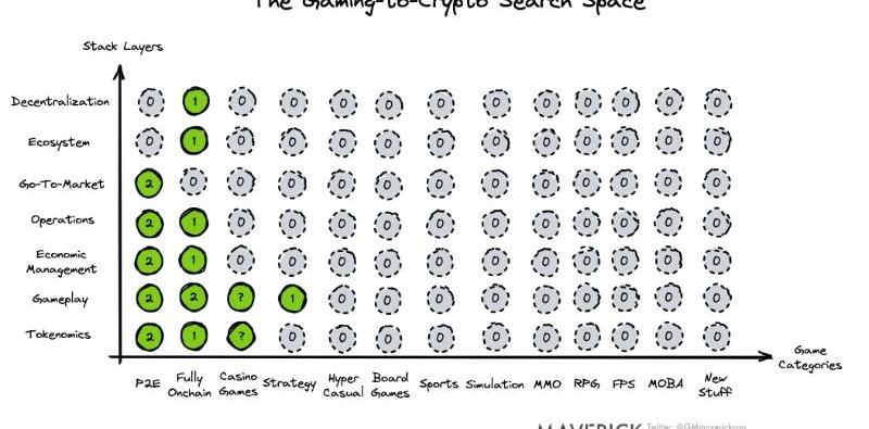 單元格:每個單元格中的數字表示加密空間已經看到的相對成功的嘗試次數。即使最終失敗,每個成功的游戲都將推動加密的集體專業知識向前發展,并使我們更接近最終解決一個或兩個單元格。迄今為止,最知名的迭代發生在P2E、完全基于鏈上、賭場游戲和策略游戲。