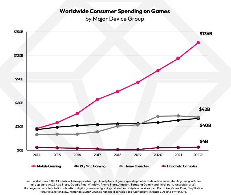 在通貨膨脹調整后,只有手機游戲增長,而PC游戲和游戲機的市場份額在下降。