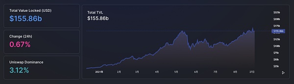 截至2021年8月31日,據 DeFi Llame 數據顯示,DeFi 總鎖倉規模逾 1,500 億美元,于8月28日創歷史新高,達到 1,650 億美元,環比增長 28.5%。