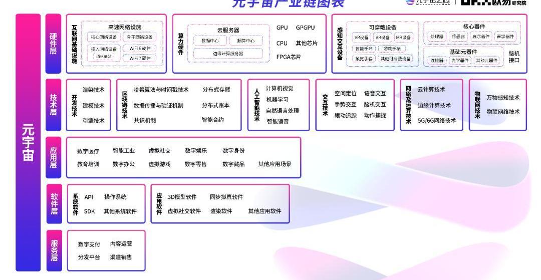 技術層分為開發技術、區塊鏈技術、人工智能技術、交互技術、網絡及運算技術、物聯網技術,為元宇宙應用場景落地提供了先決條件。