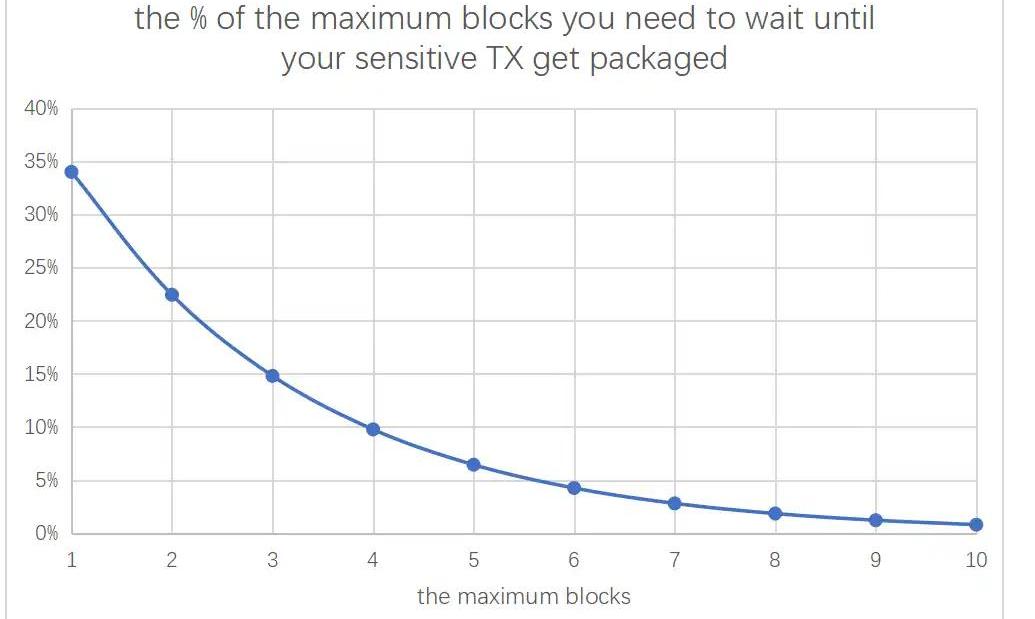 但是,還有一個指標——是討論最壞情況的,即你能不能保證你的交易至少能上鏈。咱們繼續來計算,如果還按照2/3計算,那么其實在98%的情況下,10個區塊內你的交易肯定是能上鏈的。永遠都有礦池可以不理會美國監管的要求的,你要做的,就是等待。