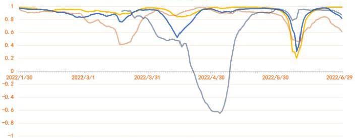 從上半年的宏觀表現來看,比特幣和以太坊除了6月以外居維持在0.8以上的強正相關性,價格隨漲隨跌。而元宇宙的藍籌代幣包括Decentraland和TheSandbox的表現與以太表現相仿,而Otherside的猴地因為本身YugaLabs的圈子效應價格表現在5月與大盤表現成負相關并跑贏大盤。