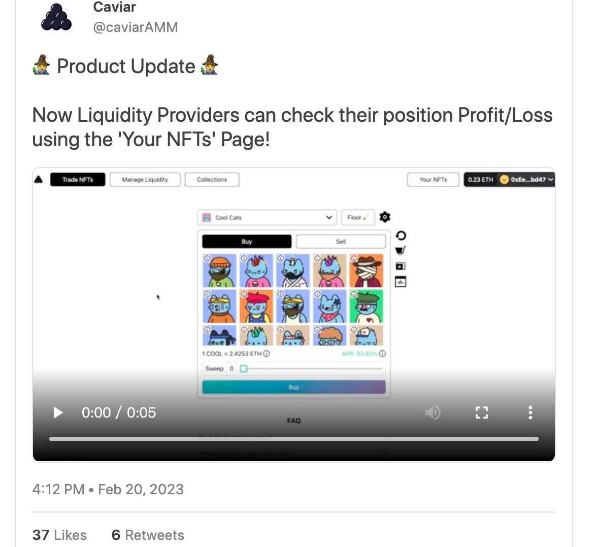 Caviar是一個用于交易NFT的NFTAMM協議。它支持ERC-20碎片化NFT,提供了一個獨特的"可取性分類器"系統,根據可取性的分數將NFT集合組織成子池。因此,每個Caviar主池有多個獨立的價格曲線,以說明整個NFT集合的流動性。通過子池系統,該協議旨在增加較稀有的NFT的流動性,并激勵流動性提供者的交易活動。Caviar的LP從每筆NFT交易中收取1%的費用。隨著越來越多的人通過一個特定的資金池進行交易,該資金池的LP相應地可以賺取更多的收益。那么,這里的策略是用ETH和NFT在活躍的Caviar池中做LP,從長期的交易活動中獲利。例如,你可以在下圖中看到,根據過去30天的交易活動,Caviar上的CoolCatsLP目前正在賺取58%的年利率。