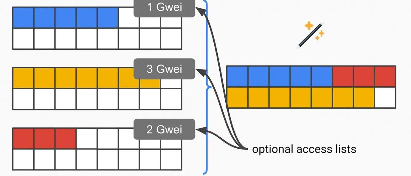 不幸的是,這并不是件簡單的事。FHE電路最大的成本是它的「深度」。特別是,它的乘法深度非常重要。例如,前面描述的刪除填充的事務「裁剪」是一個相當「淺」的電路。通過硬件加速,此類用例可能在2-3年內在計算上可行。但是,使用FHE運行整個EVM需要非常深且復雜的電路。我們終于開始在zkEVM電路方面取得一些有意義的進展,但FHEEVM甚至更遙遠。再次注意,使用可信硬件模擬此功能也是可行的。解決方案2-狀態訪問列表或者,我們可以更有限地使用FHE和訪問列表。這比運行完整的FHEEVM更容易實現——它是一個更淺的電路。在這個設置中,交易包可以包括一個加密的狀態訪問列表及其出價。這確切地指定了他們的包將訪問狀態的哪一部分。現在,區塊生產者的同態電路只需為具有不相交狀態訪問列表的交易包挑選最高出價。