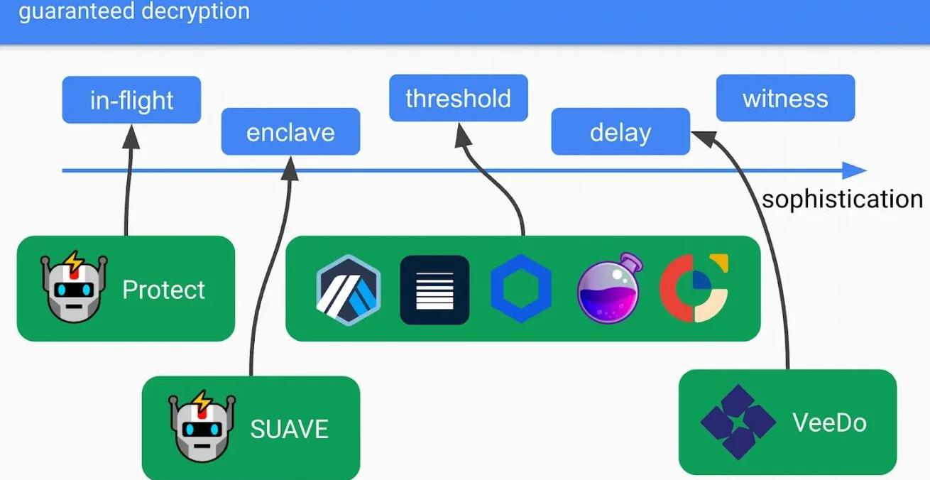 一個委員會可以聯合起來強制解密密文,但是需要簽名者達到一個門檻才能做到這一點。例如,你的「閾值」可能是需要2/3的驗證者同意解密。TED已經在幾個不同的領域進行了研究,包括:以太坊L1——ShutterizedBeaconChainShutterNetwork——以太坊L2sArbitrum——Chainlink的FSSOsmosis&Anoma——FerveoShutterizedBeaconChain