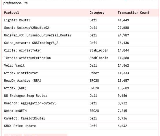 4.1.1核心數據Arbitrum活躍用戶總數:127,286Arbitrum新增活躍用戶數:23,240相比昨日增減幅:+4.53%Arbitrum存量活躍用戶數:104,046相比昨日增減幅:+23.58%4.1.2新增用戶畫像核心數據:Arbitrum昨日新增活躍用戶數23,240,相比昨日+4.53%熱門賽道情況