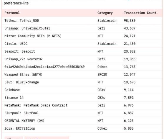 1.1.1核心數據ETH活躍用戶總數:448,939ETH新增活躍用戶數:73,238相比昨日增減幅:-5.65%ETH存量活躍用戶數:375,701相比昨日增減幅:-1.37%1.1.2新增用戶畫像核心數據:ETH昨日新增活躍用戶數73,238,相比昨日-5.65%熱門賽道情況