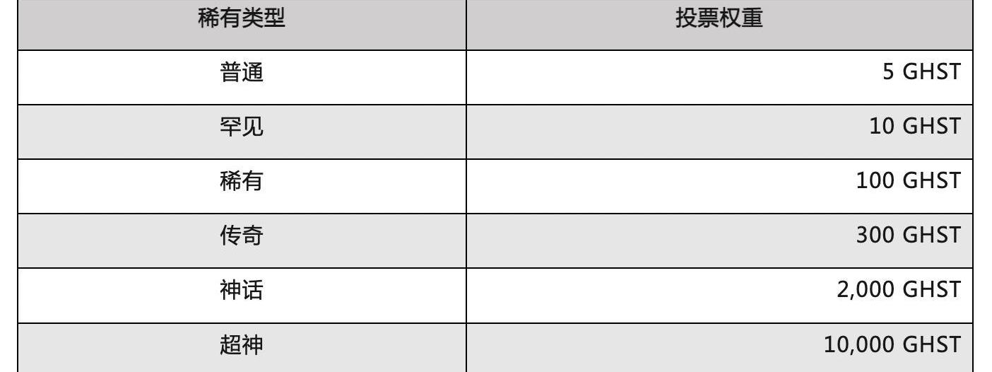 團隊也在官方wiki上發布了每種不同裝備的稀有度、數量及相應的屬性加成,感興趣的玩家可點擊此處查閱。此外,穿戴不同的裝備,在AavegotchiDAO治理中,也會擁有相應的投票權重。可穿戴裝備的投票權基于其稀有類型/市場價格,詳情如下表2-3所示:表2-2不同裝備屬性對應的投票權重