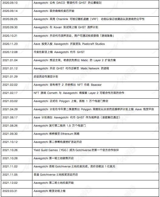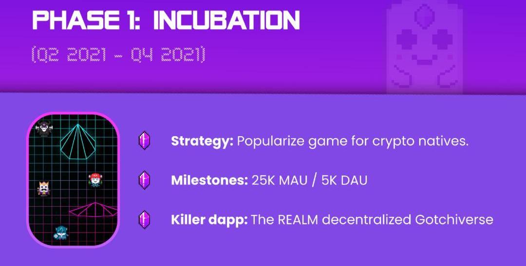 此前團隊在社區里披露了在2021年團隊有幾個關鍵的里程碑打算實現,目前均已完成或按時交付:1)將GHST列入AavePolygon借貸市場;2)計劃開發NFT的抵押借貸,即將Gotchi出租給打金的用戶,用戶無需購買NFT資產即可參與游戲,賺取收益GHST以及煉金幣將會以特定分潤比和出租人瓜分;3)推出AavegotchiAarcade——一個由社區創建的PlayToEarn迷你游戲生態系統;4)推出功能更全面的AavegotchiDAO。此外,Aavegotchi在此前也發布過項目未來三個階段的路線圖,詳情如下:第一階段
