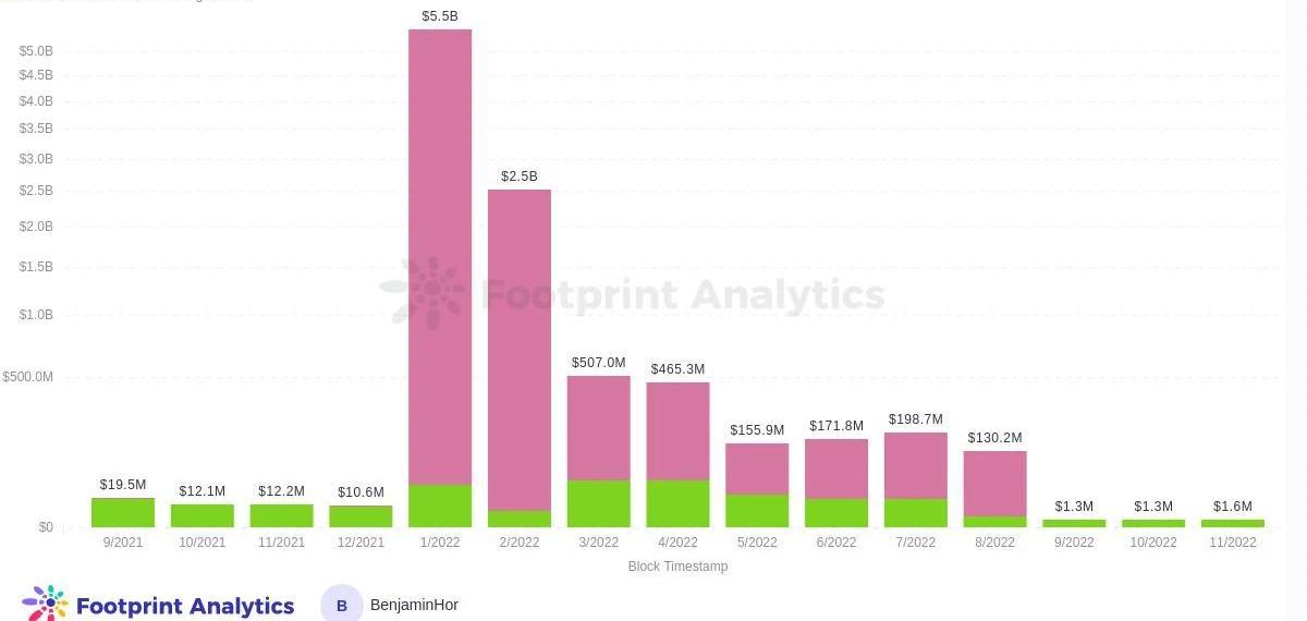 資料來源:FootprintAnalytics以上的圖包含了所以根據當時地板價低于90%以下的NFT交易。從交易行為來看,最高的月度銷售額在2021年12月,其次是2022年1月。巧合的是,這是許多司法管轄區的報稅的月份。我們可以安全的假設在這些時段的低于90%地板價交易中的大多數都涉及實現交易隨時,減交稅額的意圖。