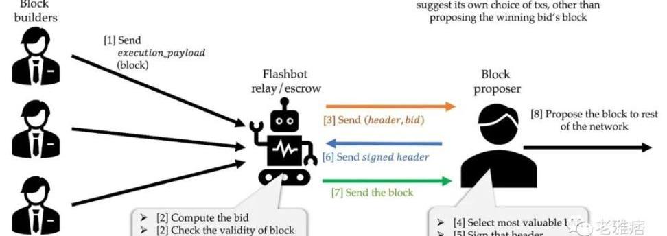 MEV-Boost解決了MEV-Geth的兩個主要不足之處:1.Solo-staker參與PoW礦工會收到bundle,然后他們將創建一個完整的區塊,將這些bundle放在頂部。他們從未被發送過完整的區塊。Flashbots從未將被OFAC列入黑名單的交易納入其bundle中,但這并不重要,因為礦工可以將它們包含在區塊的其他任何地方。這一方案意味著信任礦池運營商——他們可以清楚地看到這些bundle,所以如果他們愿意,他們可以直接為自己竊取這些機會。這種信任無法擴展到一個龐大的以太坊驗證者集合。這就是為什么MEV-Boost要為提議者提供完整區塊的原因。提議者在區塊主體被透露給他們之前簽署并提交區塊標題。如果他們在看到區塊主體后試圖MEV偷竊,他們將需要提出另一個區塊。他們的原始簽名會被呈現出來→提議者因重復簽名而被砍掉。這種全區塊方案能夠實現驗證者的去中心化,但它在中繼者/建設者層面增加了顯著的審查風險。如果驗證者接受來自審查中繼者的區塊,他們將成為事實上的審查者。如果審查建設者是最有利可圖的建設者,那么提議者就被迫在以下兩者之間做出選擇。:經濟理性——接受價值最高的區塊,即使被審查利他主義——接受價值較低的區塊,不進行審查理想情況下,利他主義假設應該被完全刪除或盡可能最小化。2.客戶多樣性大多數礦工都在運行GoEthereum(Geth)客戶端,所以Flashbots簡單地將其分叉,創建了MEV-Geth。運行它是參與FlashbotsAuction的唯一途徑。PoS是一個提高客戶多樣性的機會。MEV-Boost邊車可與所有共識和執行客戶端互操作。MEV-Boost是中立的基礎設施:中繼者——可以在任何限制或策略下自由運行(例如,審查/不審查,「公平」訂購/最大利潤等)。中繼者可以按照自己的意愿接受建設者的區塊。建設者——可以自由地運行任何他們喜歡的策略,并部署到任何他們信任的、愿意接受他們的區塊的中繼者。驗證者——可以自由運行MEV-Boost或不運行。他們可以自由地使用任何他們想要的客戶端。可以根據自己的意愿自由地連接到更多或更少的中繼者。MEV-Boost是一個有效的中繼者聚合器,它從提議者選擇的中繼者中選擇最有利可圖的出價。MEV-Boost不審查OFAC交易或三明治交易。它只是允許提議者將構建外包,從與他們匹配的中繼者中進行選擇。審查