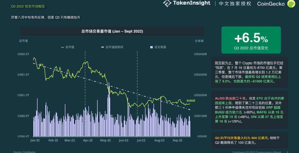 XRP/HKD+0.58%經歷了2022年第2季度的大屠殺,第3季度略顯瓶頸。盡管市場在季中對以太坊的合并有看漲預期,但市場基本上處于鞏固態勢。在第3季度末,Crypto市場總市值、BTC、ETH的價格稍有起色。但NFT并沒有享受到相同的待遇,由于市場對小圖片的興趣持續減弱,本季度NFT的交易量暴跌了約80%。考慮到全球地緣的緊張和宏觀經濟的動蕩,Crypto市場的短期前景可能仍然挑戰重重。我們在2022年第3季度Crypto市場季度報告涵蓋了從市場格局、到對比特幣和以太坊的分析、對DeFi和NFT生態的研究、以及對CEX及DEX表現的考察。以下為大家摘錄了報告的主要亮點。1.2022年第3季度,Crypto市場總市值稍有回升