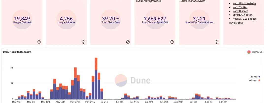 來源:DuneAnalytics-@gm365有趣的是,每天大部分Noox徽章的申請都發生在5月份。這很可能是由于V神的文章導致了SBT整體的炒作。從那時起,對于Noox徽章的鑄造需求開始下降。DeQuest