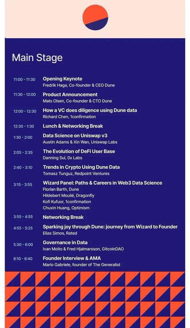 XRP/HKD-0.01%加密數據分析平臺Duneanalytics于9月15日在柏林舉辦了DuneCon大會。會議分為MainStage和Studio兩個會場,其中MainStage約持續8小時。邀請了包括UniswapLabs、0xLabs、1confirmation、Optimism等在內的嘉賓分享他們和Dune以及blockchaindata的奇遇。會場直播記錄可查看官網:https://dunecon.com/livestreamDodoResearch以Topic分類,對本次大會的內容進行了解讀和整理:
