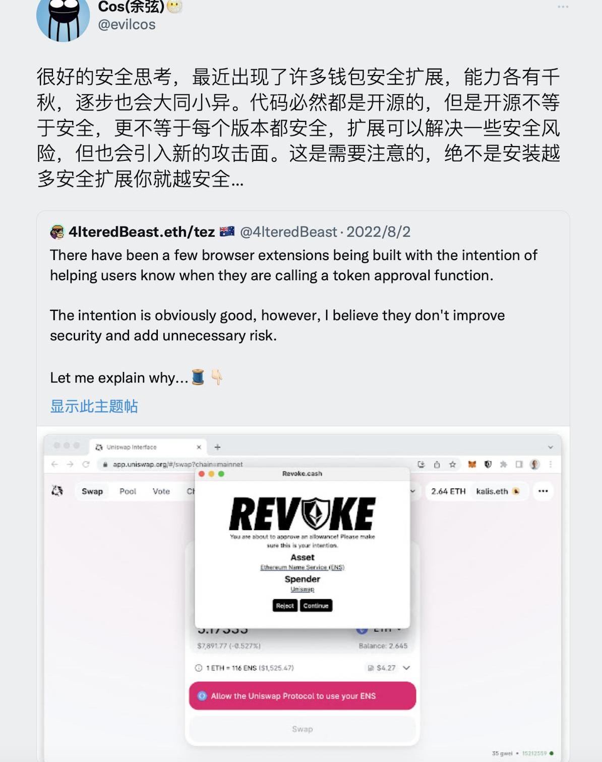但是NoScript有一點的上手習慣門檻,有時候可能會很煩,我的建議是對于重要的域名訪問可以在安裝了NoScript的瀏覽器(比如Firefox)上進行,其他的盡管在另一個瀏覽器(如Chrome)上進行。隔離操作是一個很好的安全習慣。許多你可能覺得繁瑣的,駕馭后、習慣后,那么一切都還好。但是這并不能做到完美防御,比如這次@CurveFinance的攻擊,攻擊者更改了其DNSA記錄,指向一個IP_BAD,然后污染了前端頁面的:https://curvefi/js/app.ca2e5d81.js植入了盜幣有關的惡意代碼。如果我們之前NoScript信任了Curve,那么這次也可能中招。可能有人會說了要不要多安裝一些瀏覽器安全擴展,我的看法之前已經提過: