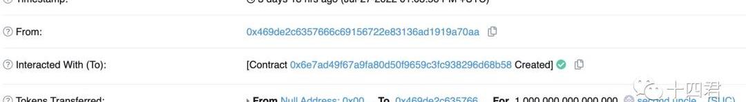 此幣部署在BSC幣安智能鏈上并且做了開源驗證,都可以通過下地址翻閱到若干證據。區塊鏈瀏覽器如何使用可見前文:當我們在看Etherscan的時候,到底在看什么?項目方地址:0x469de2c6357666c69156722e83136ad1919a70aa二舅幣合約地址10x6e7ad49f67a9fa80d50f9659c3fc938296d68b58二舅幣合約地址20xe67cff48da0156e7978bc5a9a44d516a48d2a1d6筆者從7.31號下午3點開始撰寫本文,拉取到的二舅幣鏈上交易共計1686條。最初的部署操作的初始化環節,給項目方自己發了1,000,000,000,000,000個二舅幣。