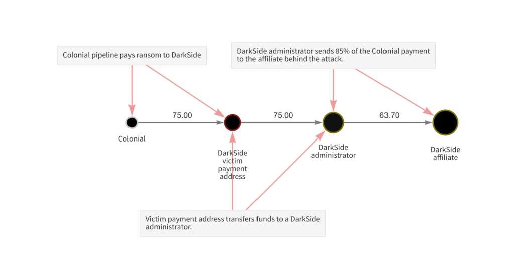 Colonial先向攻擊者提供的地址轉賬了75枚比特幣。然后這些贓款被轉移到DarkSideadmin的地址,而admin只將贓款的85%轉給了DarkSide的聯盟客。這種分贓方式意味著DarkSide提供了RaaS,這個聯盟客使用它的技術進行攻擊。