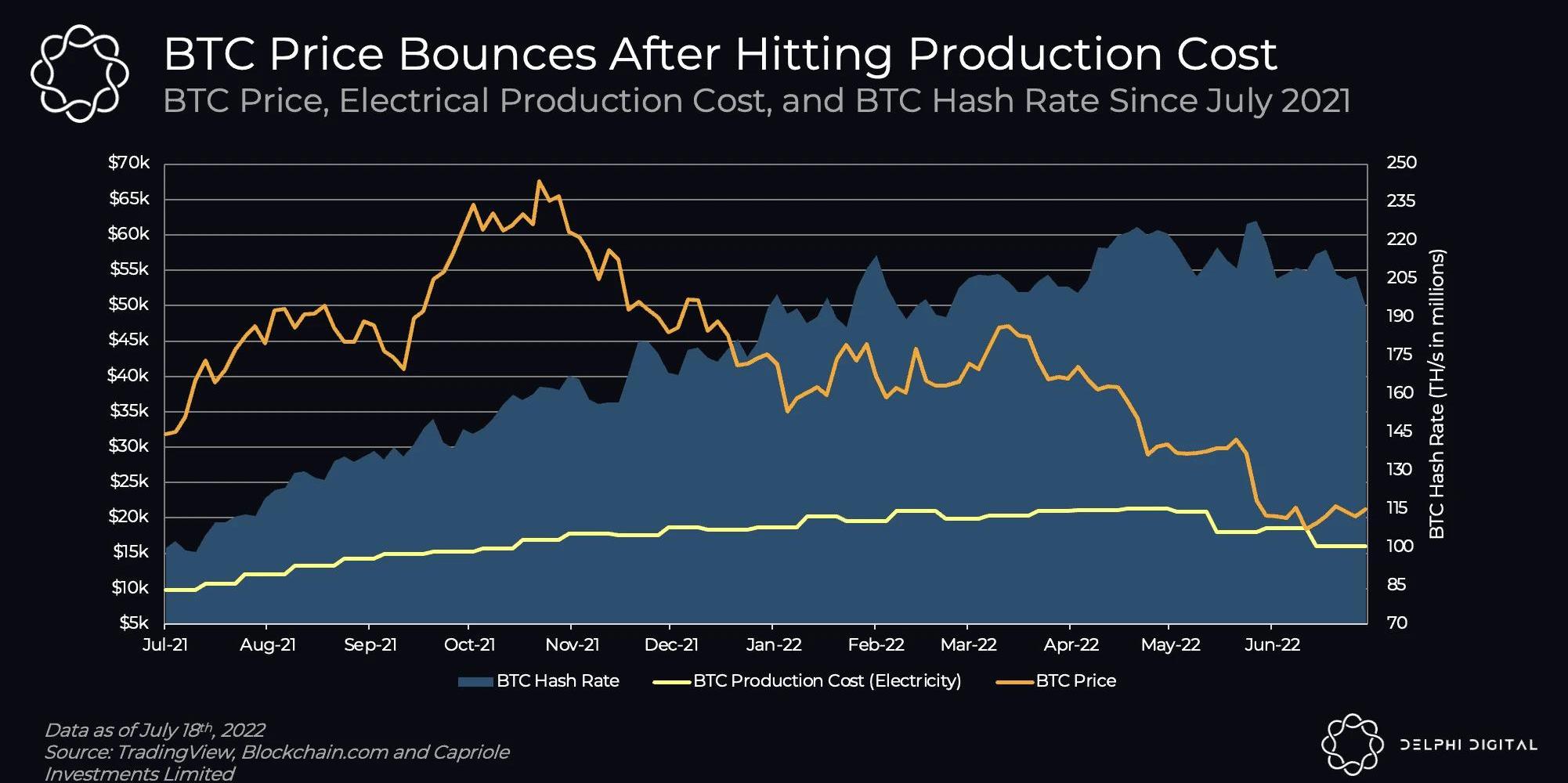 BTC價格在達到生產成本后反彈。在過去5年中,開采1BTC的電力挖礦成本一直代表著BTC的價格下限。目前估計挖礦成本略高于16000美元。