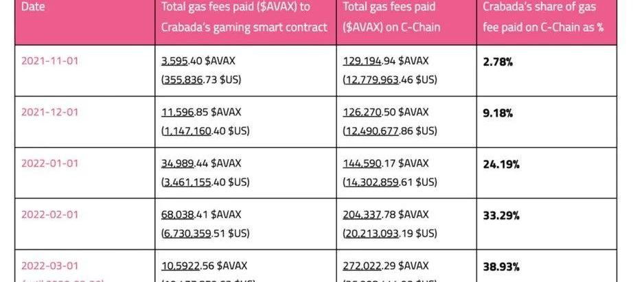 資料來源:https://cryptodaily.io/how-crabada-is-paving-the-way-for-p2e-games-on-avalanche/從上表中可以看出,Crabada在Avalanche公司C鏈的gas費用中所占份額最高,為38.93%。然而,與許多Web3游戲類似,Crabada也面臨著主網網絡擁塞的問題,這促使它們轉向自己的鏈,如子網。最近,Crabada從AvalancheC鏈轉移到了他們自己的子網SwimmerNetwork。隨著向SwimmerNetwork的遷移,Crabada玩家的gas費降低了85%,交易時間也大大縮短。除了較低的gas費用和較高的TPS,還有其他好處可以吸引web3游戲采用子網。通過擁有自己的子網,Web3游戲基本上可以更好地控制區塊鏈的預定參數。他們可以用自己選擇的代幣支付gas費用。現在,Crabada使用$TUS而不是$AVAX作為gas代幣,在網絡擴展過程中燃燒高達80%的gas。銷毀代幣抑制了代幣通脹,提高了代幣效用。需要注意的是,游戲工作室一直在為整個游戲生態系統構建子網,而不是Crabada或DeFiKingdoms采用的典型的每個子網一個游戲的模型。Avalanche還表示支持在其子網上創建Web3游戲。在最初計劃的1.9億美元的AvalancheRush啟動了DeFi生態系統之后,接下來的2.9億美元的Multiverse計劃旨在加速生態系統的增長。Polygon超級網絡和側鏈