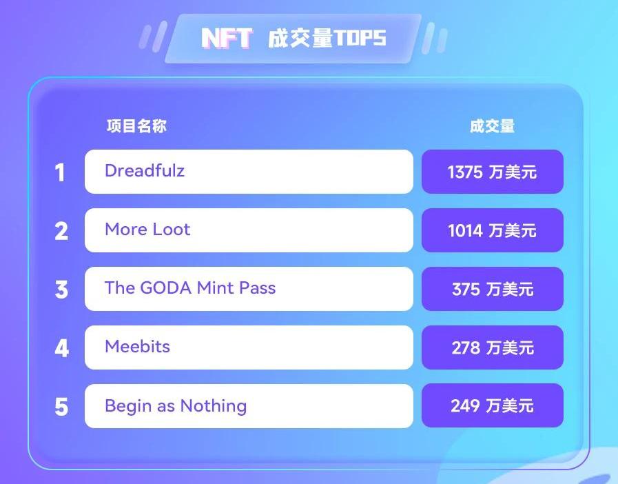 按過去24小時成交量,排名前五的項目分別為Dreadfulz、MoreLoot、TheGODAMintPass、Meebits和BeginasNothing。