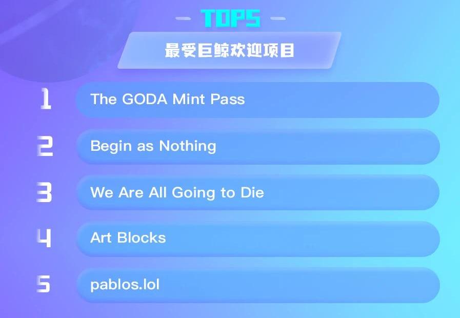 最受巨鯨歡迎項目排前五的分別是:TheGODAMintPass、BeginasNothing、WeAreAllGoingtoDie、ArtBlocks和pablos.lol。