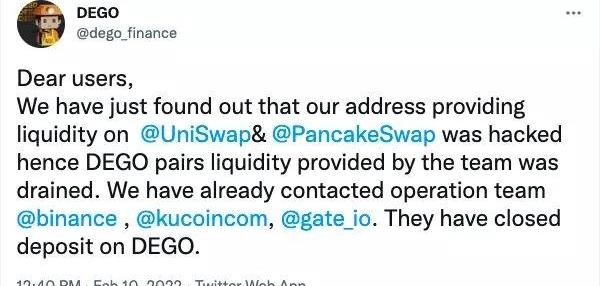 XRP/HKD+0.56%2月10日,成都鏈安鏈必應-區塊鏈安全態勢感知平臺輿情監測顯示,DeFi應用DegoFinance遭到黑客攻擊,UniSwap和PancakeSwap上的DEGO流動性已被耗盡。關于本次攻擊,成都鏈安技術團隊第一時間進行了資金流向分析。