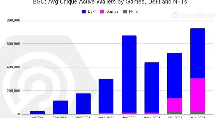 在我們8月份的行業報告中,我們強調幣安智能鏈是最常用的區塊鏈。上個月,幣安品牌的網絡吸引了近100萬個獨立錢包,其中近40%來自一個游戲DApp。進一步研究BSC的分類,我們發現DeFi錢包仍然占據主導地位,大約有42.5萬個獨特錢包連接到DeFiDApp,而與BSC游戲互動的錢包只有27.9萬個。然而,分析月度趨勢,補充了游戲的敘事。