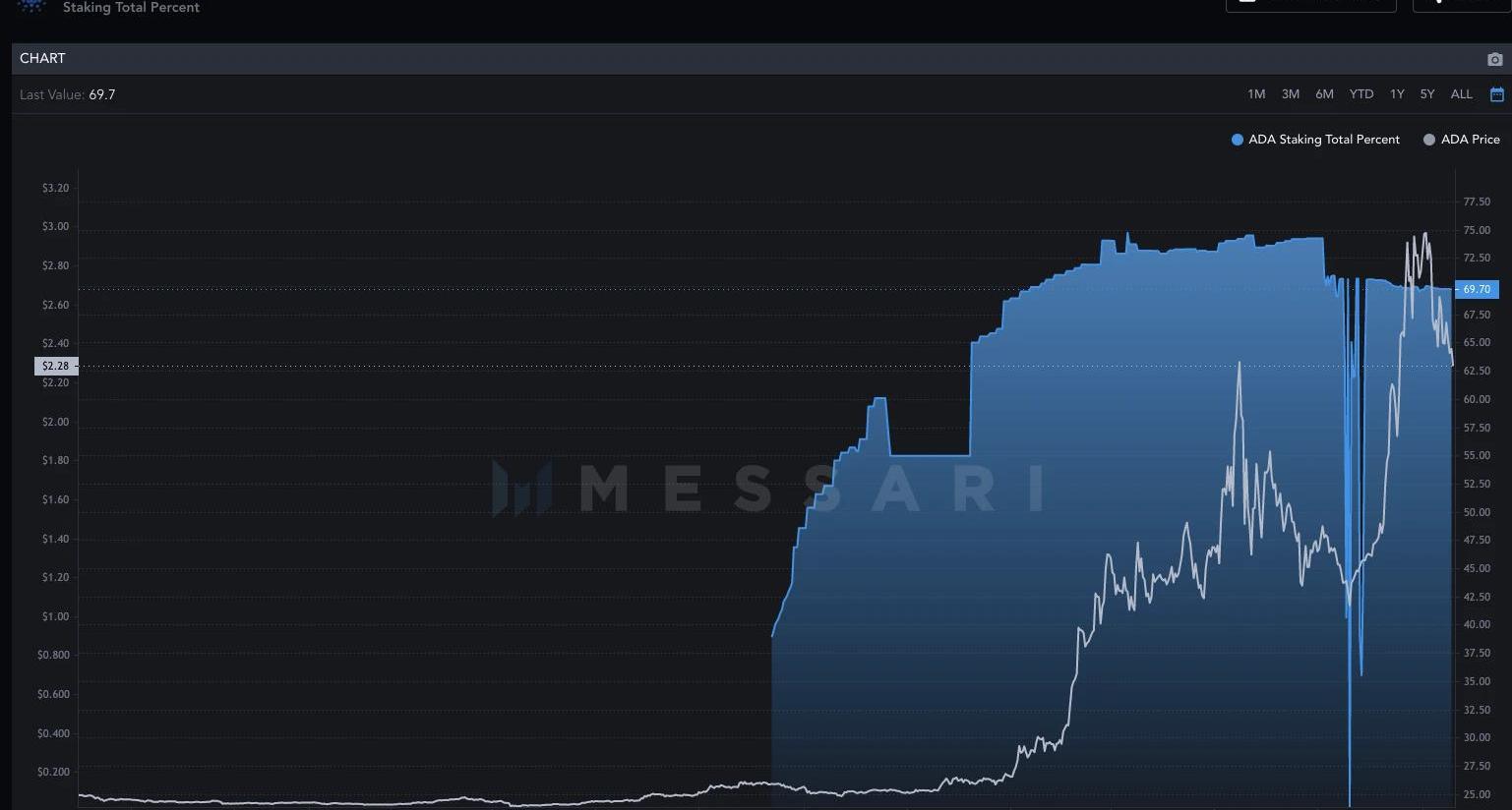 市值排名第4名的加密貨幣,是Cardano的原生貨幣ADA。Cardano是另一個智能合約區塊鏈,目的是成為行業中最重要的網絡之一。近幾個月來,ADA獲得了不小的增長,主要是由于Cardano主網的發展進展,包括推出智能合約。目前,ADA的主要用途是通過委托礦池進行質押。據Messari報道,約70%的ADA被質押。這意味著,就目前而言,ADA的大部分價值將保持不變,在未來幾個月里,約2.45%的市值可能仍將被鎖定。
