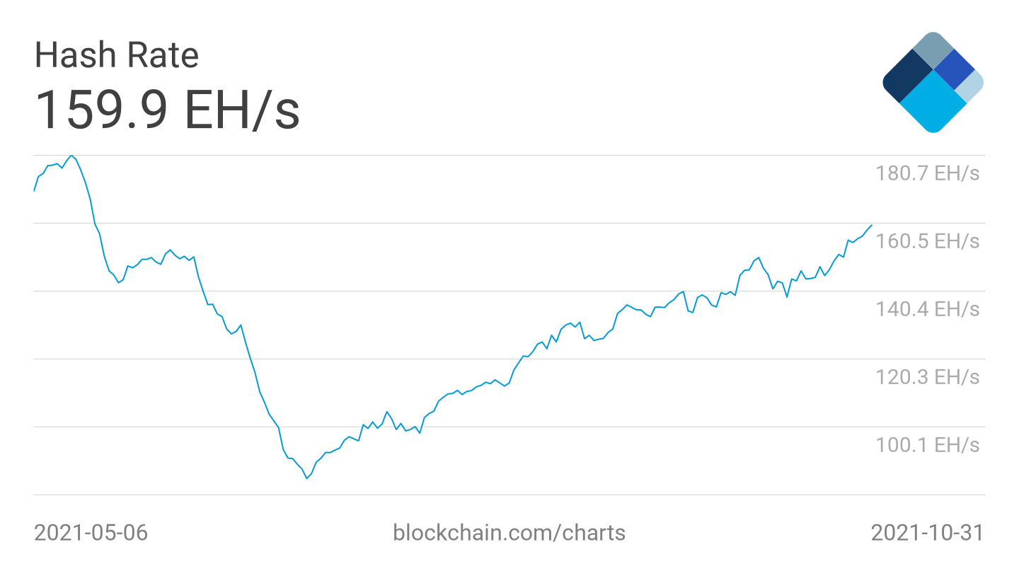 原始數據有上升和下降的趨勢,不同的估計往往會得出相當不同的讀數。然而,每周平均算力現在約為159 EH/s——比以往任何時候都更接近4月份的180 EH/s。