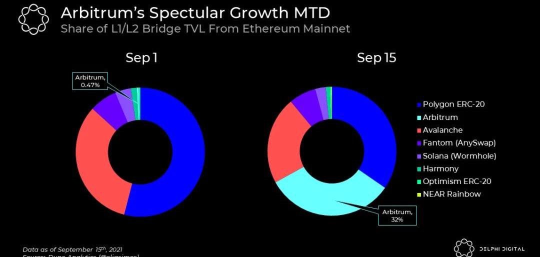 Arbitrum的橋合約在9月1日僅鎖定了2200萬美元,這意味著該橋接僅占以太坊各種橋的總TVL的0.047%。在過去的兩周里,一些投機收益耕種將這一份額推高至32%——在短短15天內將橋份額增加了640倍。如上所述,Arbitrum的大部分資本都在種植一種極具投機性的代幣NYAN,因此這不一定表明這是由遷移到Arbitrum的優質項目驅動的。然而,鑒于很快將在Arbitrum上部署的項目的規模,不要天真地期望這種情況不會發生。