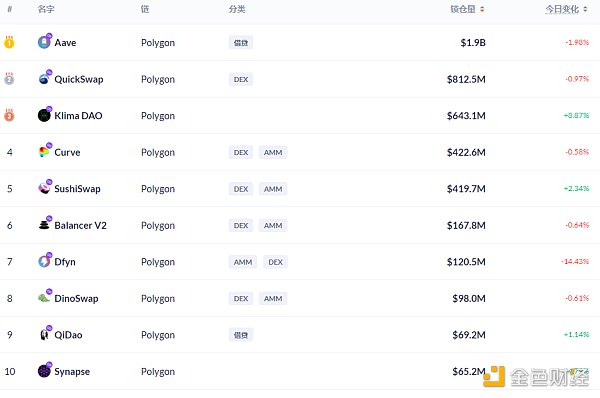 Polygon鏈上DeFi鎖定資產前十排名及鎖倉量,數據來源:Debank